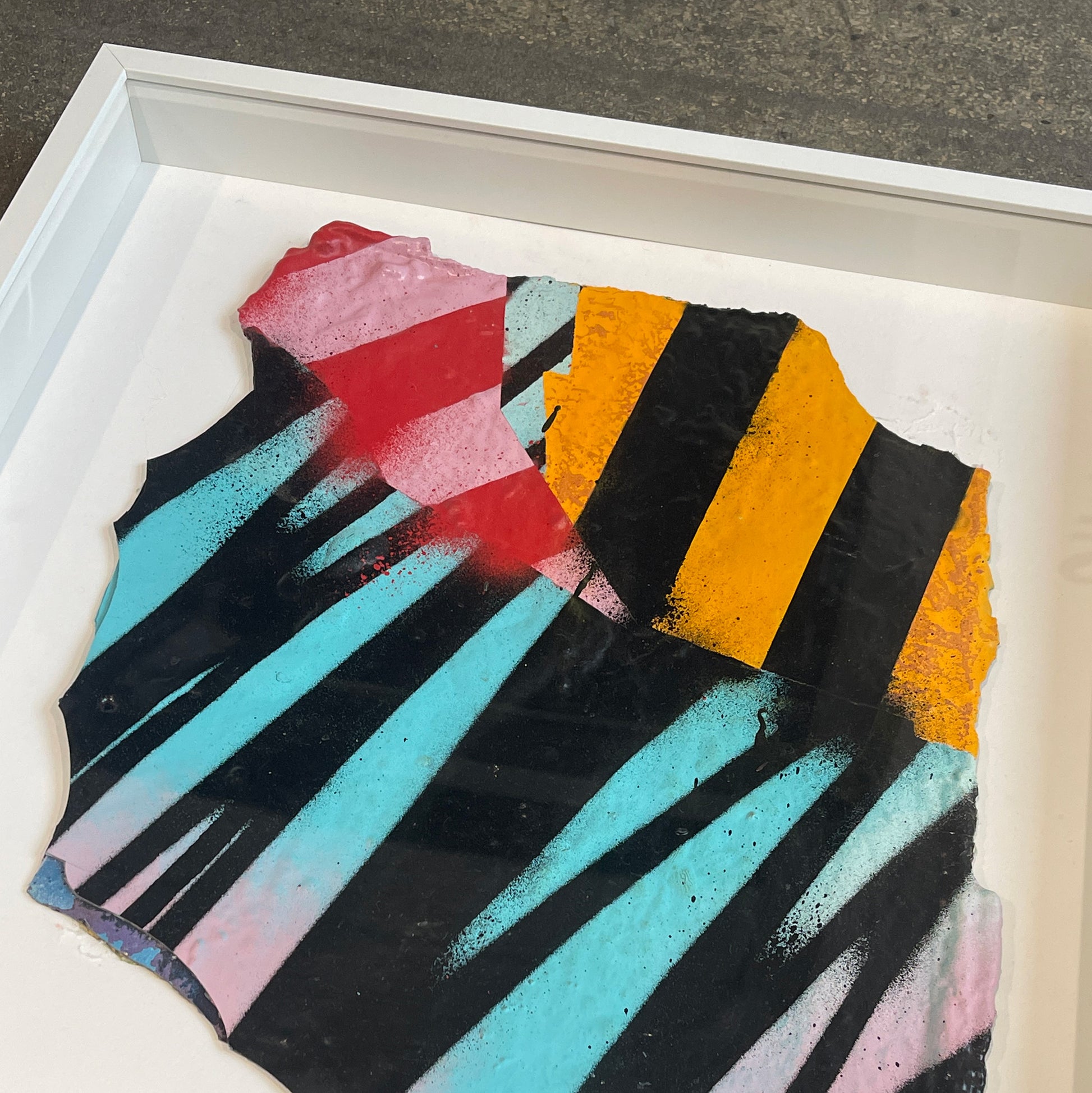 Add a vibrant, contemporary touch to your space with this totally unique abstract mixed media wall art. Featuring striking diagonal stripes in vivid turquoise, yellow, red, and black on a glossy, irregularly shaped surface, this piece brings bold energy and urban flair to any interior. Framed in a minimalist white box frame, it’s ready to hang and perfect for modern, industrial, or eclectic decor.