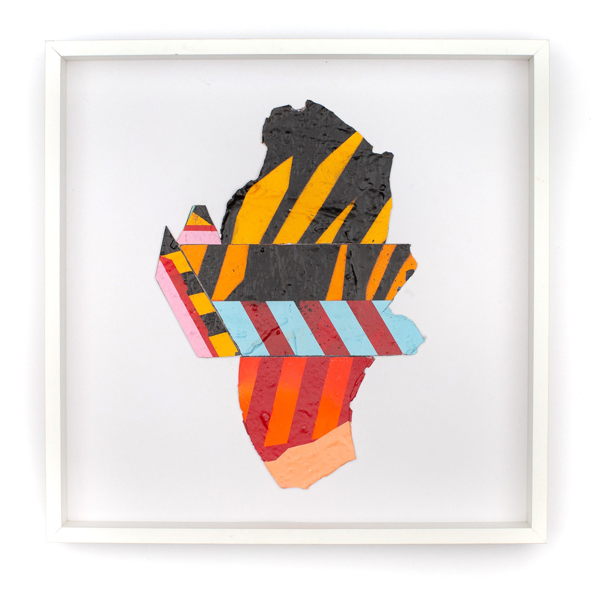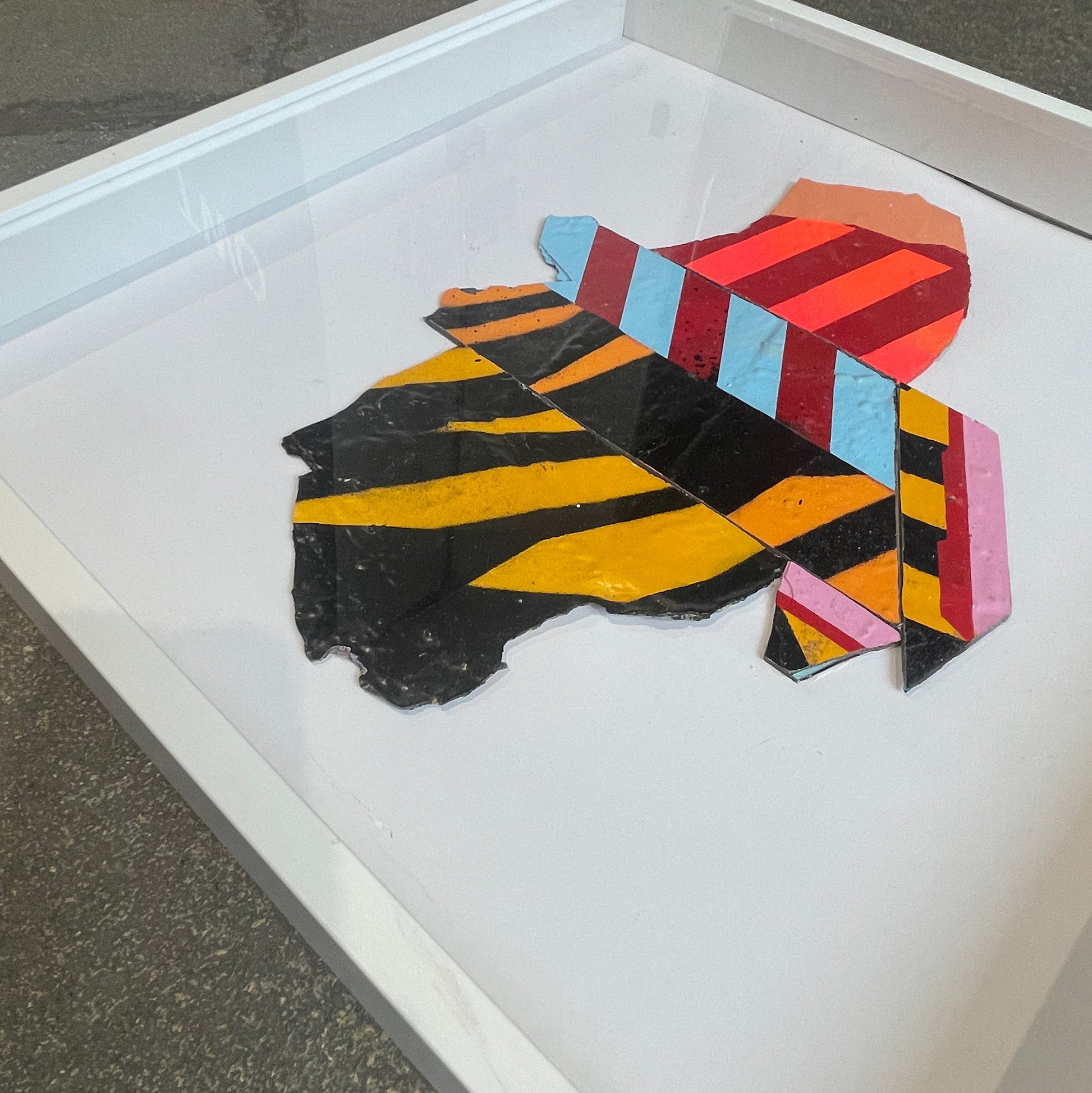 Add a vibrant, contemporary touch to your space with this totally unique abstract mixed media wall art. Featuring striking diagonal stripes in vivid turquoise, yellow, red, and black on a glossy, irregularly shaped surface, this piece brings bold energy and urban flair to any interior. Framed in a minimalist white box frame, it’s ready to hang and perfect for modern, industrial, or eclectic decor.