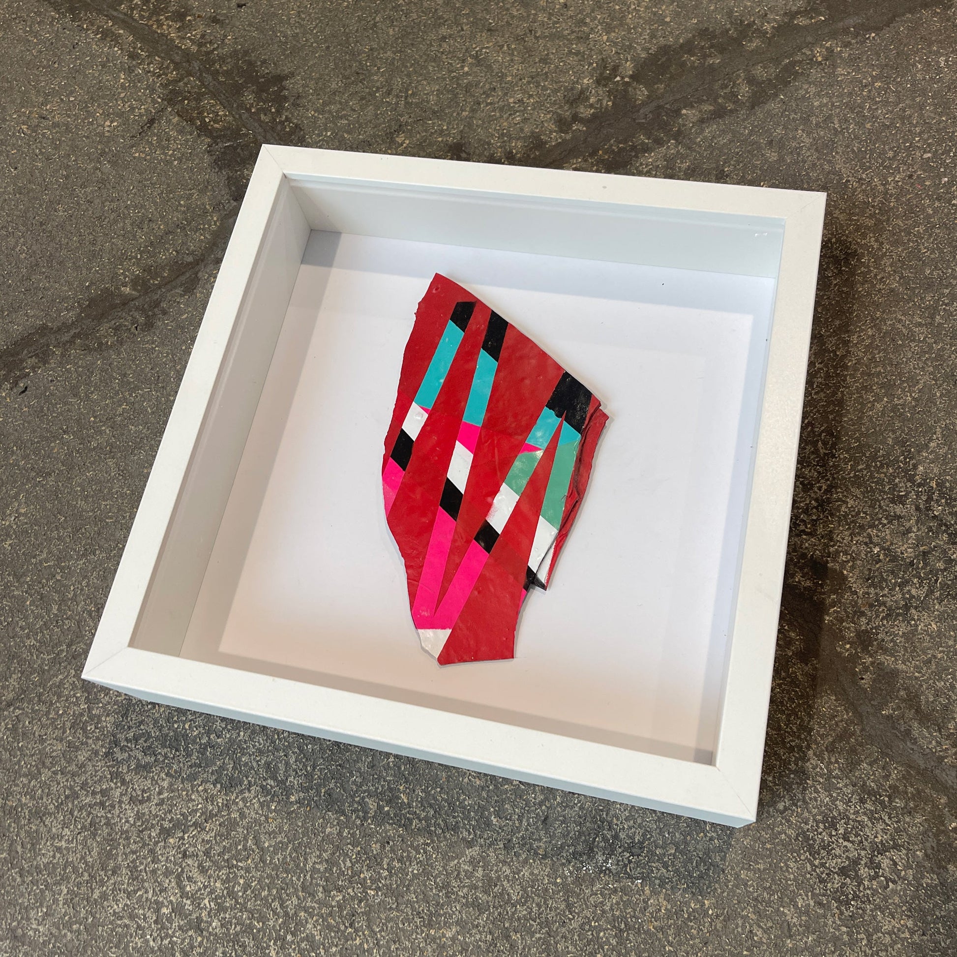 This is a vibrant contemporary art piece in a clean white box frame. The paint flake displays bold geometric contrasting patterns with vivid neon hues and a textured, surface due to its build up over time on a brick surface, creating a totally unique striking, modern aesthetic perfect for minimalist, contemporary or urban-inspired interiors.